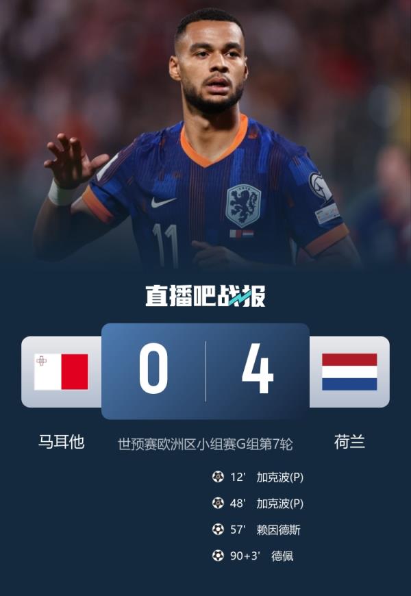 上半場赫拉芬貝赫造點,加克波點射閃擊得手,下半場加克波點射完成雙響,賴因德斯推射擴大比分,德佩替補建功,最終荷蘭4-0馬耳他三分領跑。