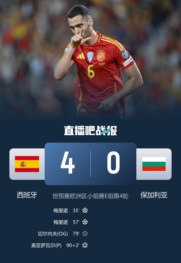 西班牙4-0保加利亞四連勝領跑 梅里諾雙響+造點奧亞薩瓦爾點射