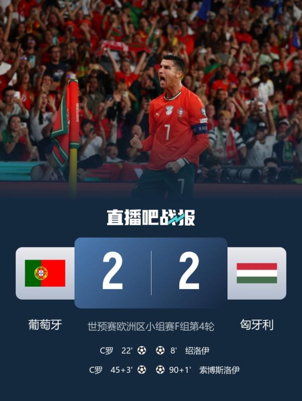 世預賽歐洲區(qū)小組賽F組第4輪,葡萄牙2-2匈牙利,無緣本輪晉級世界杯正賽,C羅梅開二度。