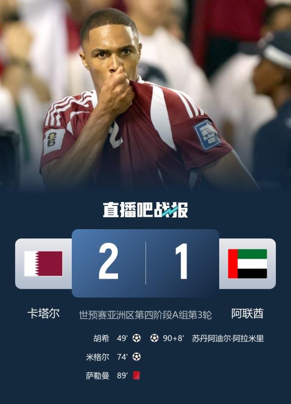世預賽亞洲區(qū)第四階段A組第3輪,10人卡塔爾2-1戰(zhàn)勝阿聯(lián)酋,晉級2026年世界杯正賽。