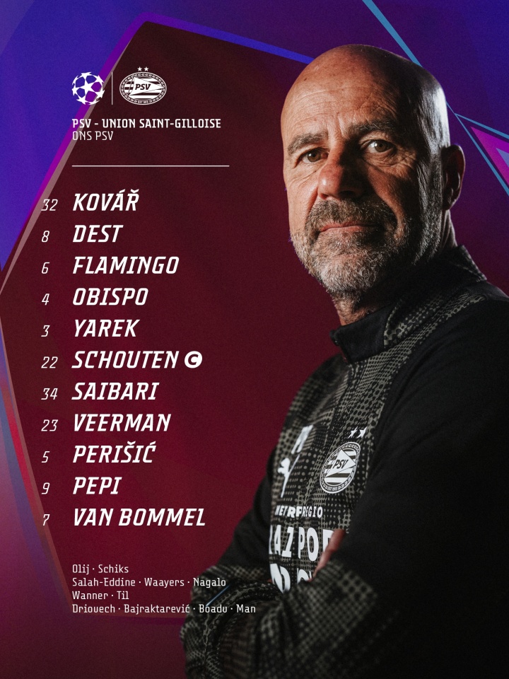 埃因霍溫替補:1-奧萊、24-??怂?、2-薩拉赫-埃丁、20-古斯-蒂爾、10-萬納爾、11-德里歐、19-巴伊拉塔雷維奇、21-布阿杜、27-丹尼斯-曼、39-納加洛、威爾斯