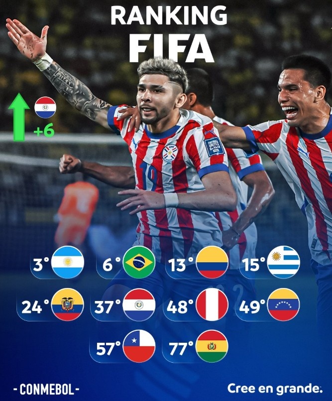 9月19日訊 國(guó)際足聯(lián)公布了新一期的國(guó)家隊(duì)排名情況,南美足聯(lián)10個(gè)成員國(guó)中,巴拉圭本期排名上升幅度最高,提升了6個(gè)位次。