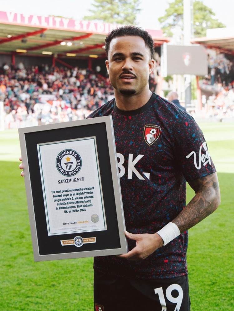 9月19日訊 伯恩茅斯俱樂部官方消息,球隊邊鋒賈斯汀-克魯伊維特獲得吉尼斯世界紀(jì)錄認(rèn)證,成為英超單場主罰點球最多的球員。